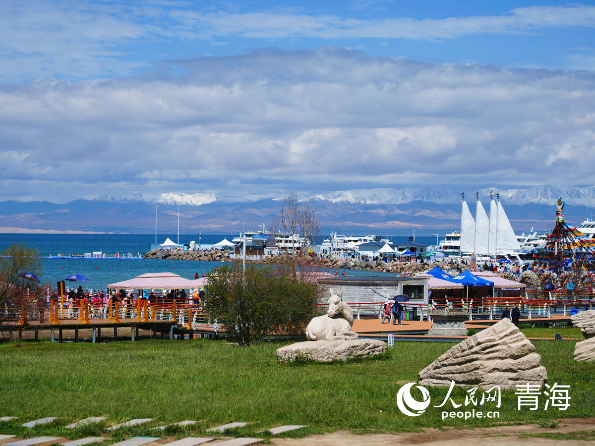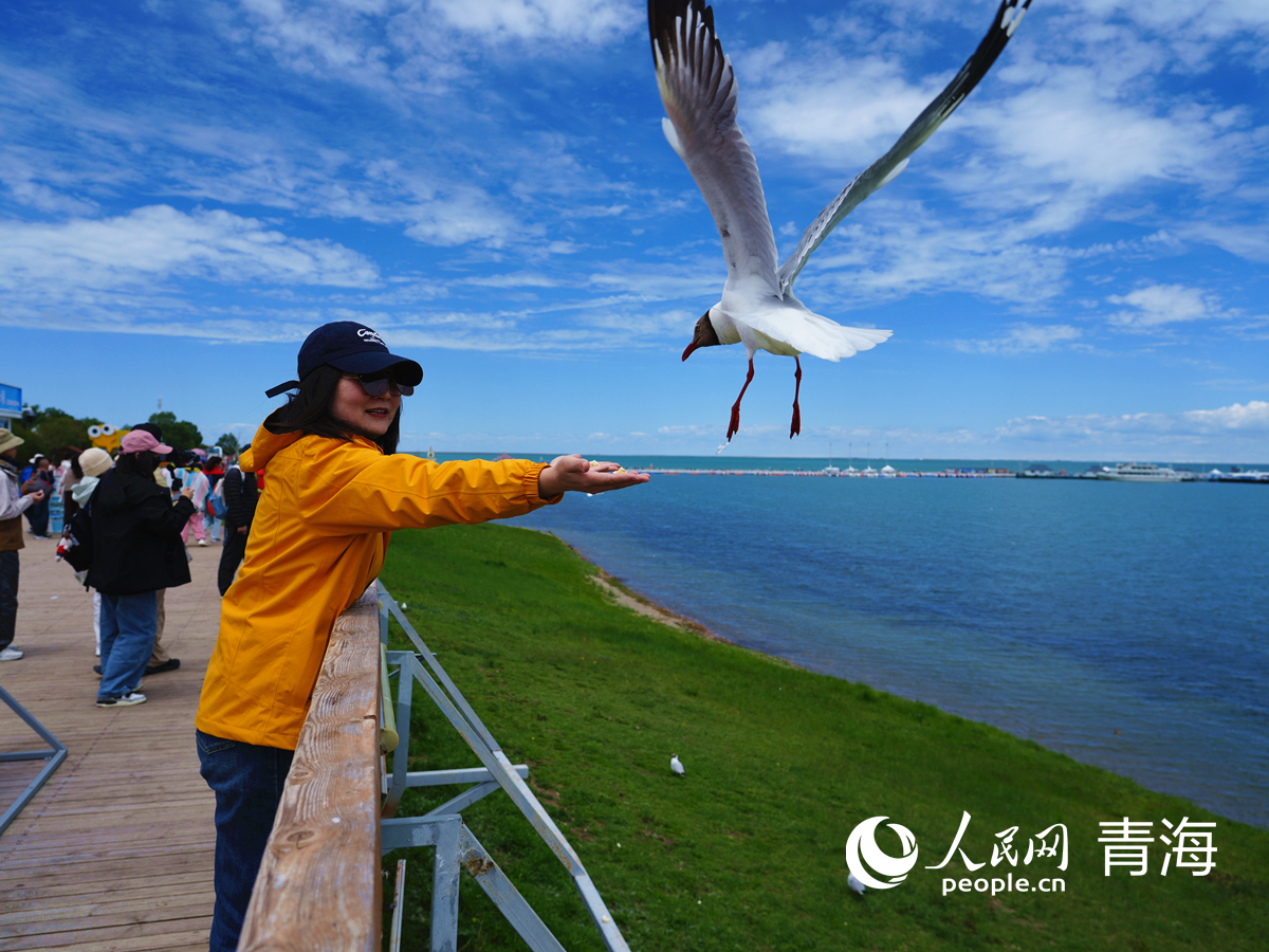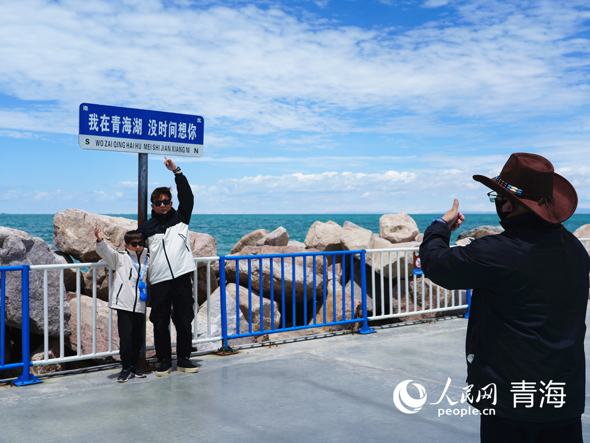 游客在青海湖景区拍照留念。人民网记者 杨启红 摄