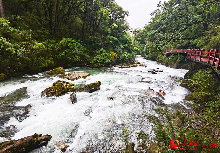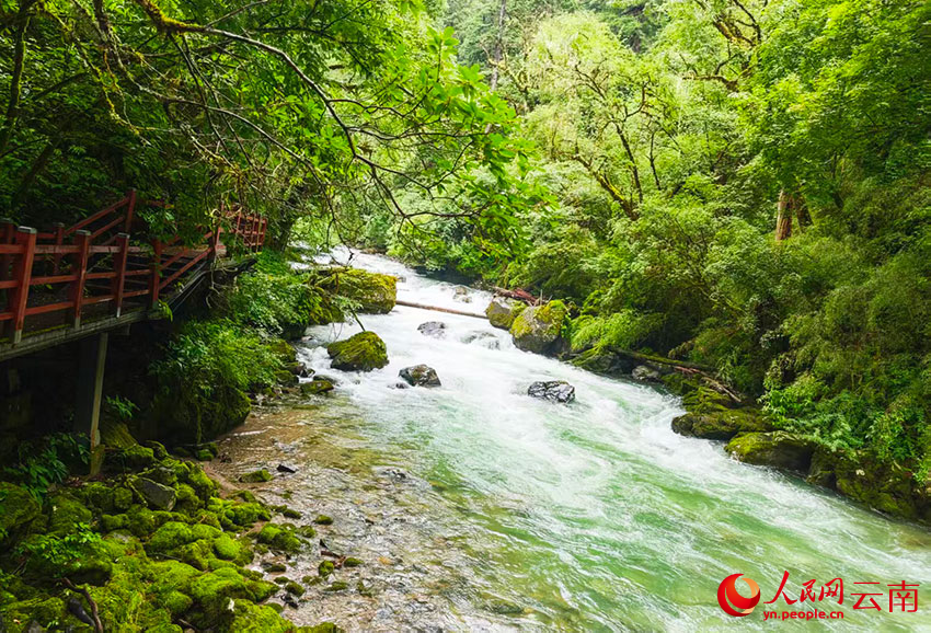 从尼汝村出发,小路和栈道随尼汝河蜿蜒延伸。河水如碧绿丝带穿林而过,水流撞击礁石的声响与林间鸟鸣交织成天然交响曲。河岸两侧云杉与冷杉高耸入云,树干上的松萝随风轻摆,阳光透过枝叶洒下斑驳的光影。