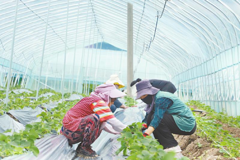 松岗镇村民在草莓基地铺地膜。刘文佳 摄