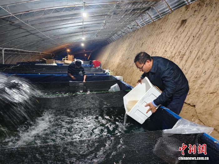 资料图为许洪彬(右)在乌兰县小龙虾养殖大棚内投放虾苗。苏言晶 摄