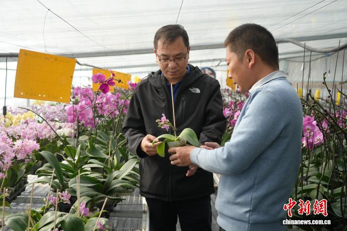 资料图为许洪彬(左)在乌兰县蝴蝶兰花卉大棚内观察长势。苏言晶 摄