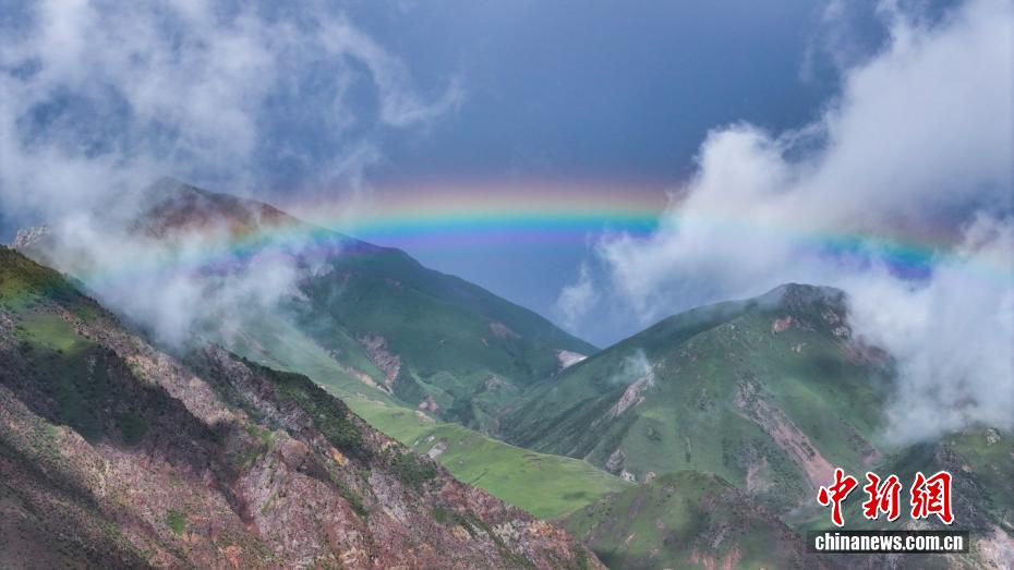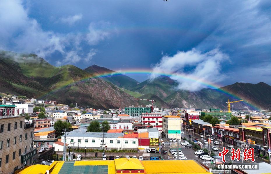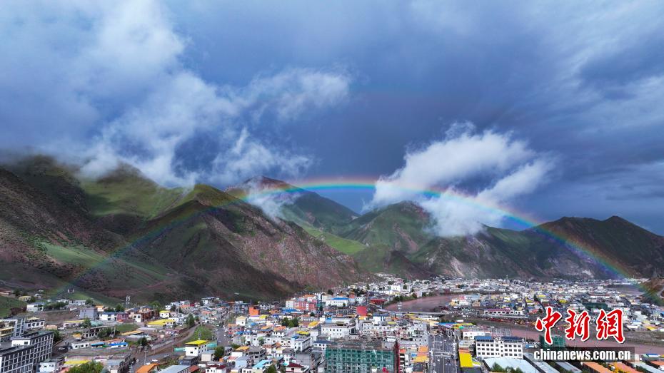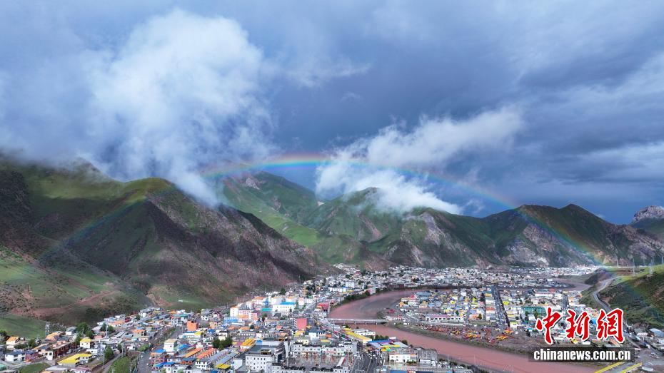 8月21日,参加2025澜湄国际影像周的中外嘉宾来到澜沧江源第一县——青海省玉树藏族自治州杂多县进行采风拍摄。傍晚时分,一场降雨后,县城上空出现彩虹美景。(无人机照片)中新社记者 马铭言 摄
