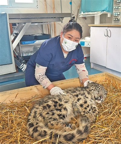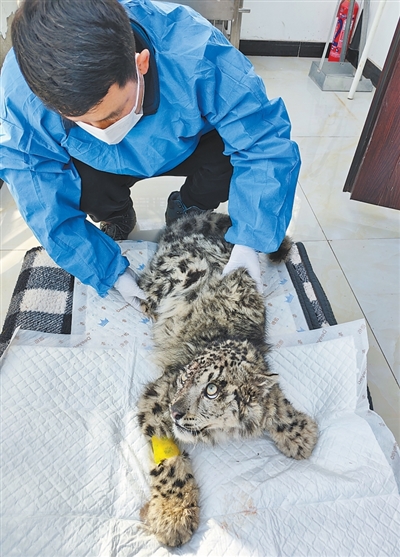 3月5日下午,雪豹抵达西宁野生动物园兽医院。经初步诊断,雪豹体重不到20斤,有低温、脱水、骨折、腹泻、肝功能异常等问题。兽医杨文斌回忆:“它从高空坠跌下来,颈、胸椎和后肢软组织都有损伤。”经过抽血化验、处理伤口,雪豹被送入恒温氧舱,工作人员轮流值班观察,持续给它输液……