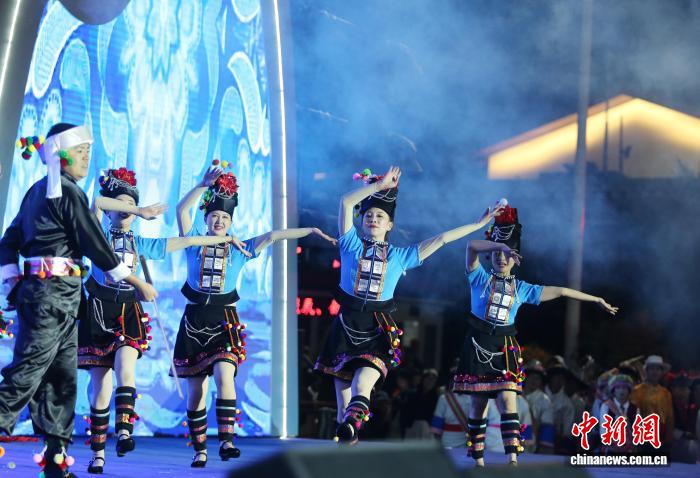9月27日晚,迪庆州香格里拉市代表队表演舞蹈《阿卡巴拉》。中新社记者 黄兴鸿 摄
