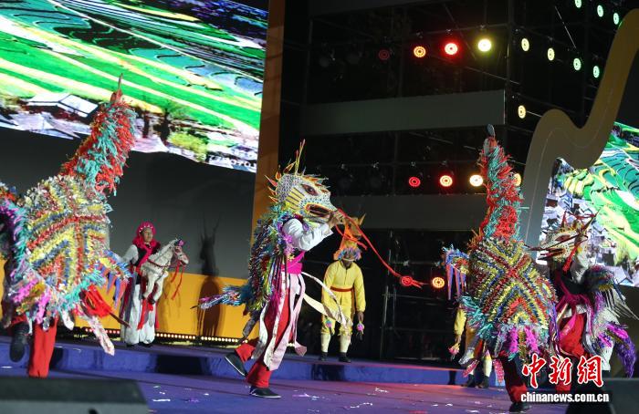 9月27日晚,迪庆州代表队表演舞蹈《金鸡马鹿》。中新社记者 黄兴鸿 摄