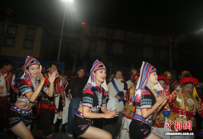 9月27日晚,迪庆州维西傈僳族自治县代表队表演舞蹈《塔城热巴》。当日,“遇见云南·舞动香格里拉”民族团结大联欢在迪庆藏族自治州香格里拉市举行。云南16个州市的演员精彩演绎了21个舞蹈,并与近万名游客开展大联欢。中新社记者 黄兴鸿 摄
