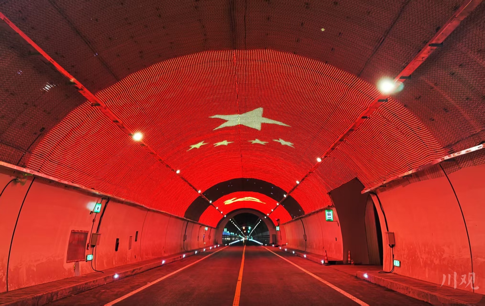 隧道中间位置,长约100米范围内,密密麻麻的led灯珠被挂上搭好的电线网。未来,一面五星红旗将出现在隧道顶端,红色的光芒映射司机前行的路。