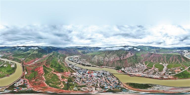 这里是黄河流经的青海省果洛藏族自治州玛沁县拉加镇,地处黄河谷地,海拔较低,气候宜人,被誉为“果洛小江南”。黄河蜿蜒穿过拉加镇,阿尼玛卿山脉与红土山共同守护着这片宁静的土地。