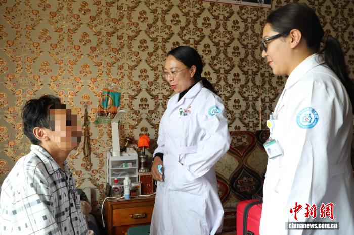图为尼玛拉毛(右)在柯曲镇卫生院内为患者诊治。马铭言 摄