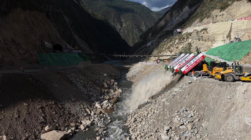 10月28日,自卸卡车将石料倾倒入孟底沟水电站龙口位置。(雅砻江流域水电开发有限公司供图)