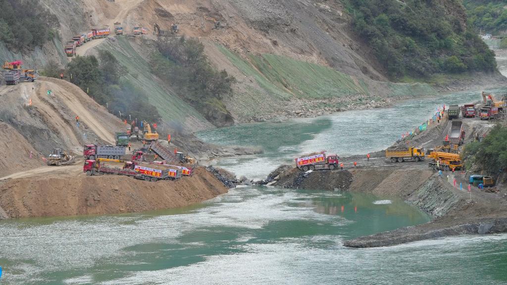10月28日,自卸卡车协同作业将成吨石料抛投进牙根一级水电站主龙口位置。(雅砻江流域水电开发有限公司供图)