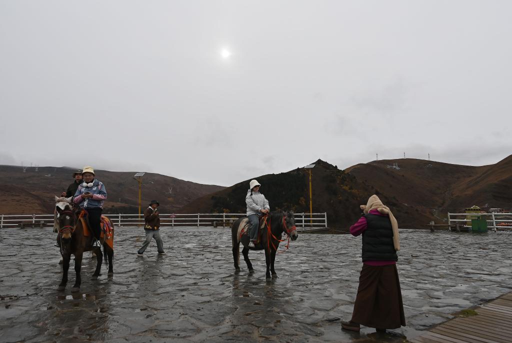 深秋时节的川西高原,天高云阔、景色壮丽,塔公草原景区里,不少游客正体验骑马游玩。