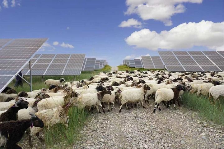 绿草如茵接天涯,牛羊成群映彩霞。每年6月至10月,塔拉滩周边牧民的羊群都可以免费进入光伏园区吃草,羊群在光伏板下活动,排泄的粪便成为草场的天然肥料,促进板下植被健康生长,形成良好生态循环。