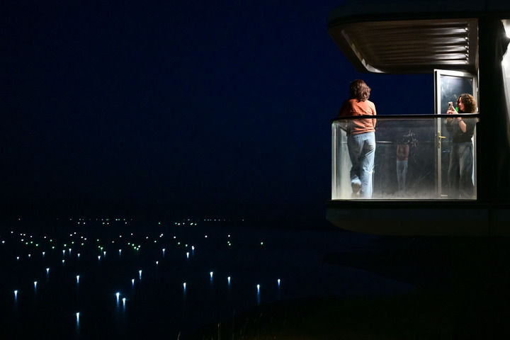 “我这会儿下网,等到凌晨1点再出船起网。天快亮了,带着一箱箱小银鱼回来。”许昌边固定船锚边说。十多年来,他每年渔期都在湖边度过——凌晨出船,拂晓而归。说话间,他回到岸边帐篷,拉下电闸。眨眼间,一串串渔灯亮起,融入湖面灯海。
