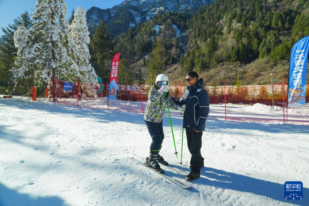 九寨华美胜地度假区穹恰冰雪大世界工作人员在协助游客体验滑雪(2025年1月1日摄)。新华社发