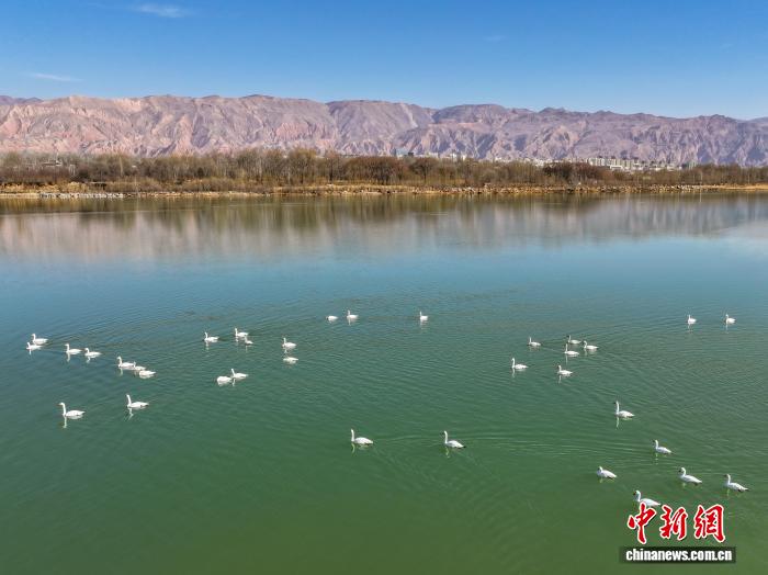 12月11日,大天鹅在青海省黄南藏族自治州尖扎县黄河流域自在游弋。随着当地生态环境持续向好,每年都会有成群的大天鹅在此越冬,冬日黄河尽显生机。中新社记者 马铭言 摄