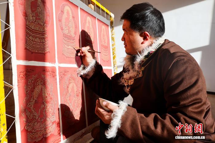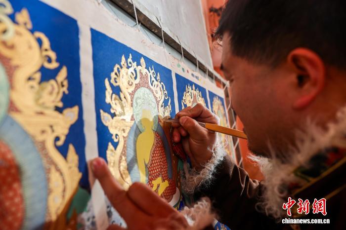 12月10日,青海省黄南藏族自治州同仁市胜境画院内,唐卡画师夏吾尖措绘制唐卡。热贡唐卡源于当地独特的文化生态,被誉为绘画艺术中一面独具韵味的旗帜。如今,许多画师通过系统授徒、开办传习工坊等方式,将调色、勾线、描金等核心技艺传授给年轻一代,让古老技艺得以传承和延续。中新社记者 薛蒂 摄