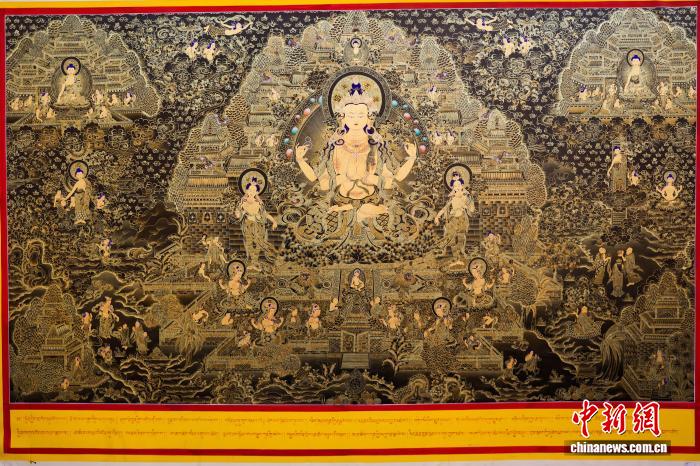 12月10日,青海省黄南藏族自治州同仁市胜境画院内,夏吾尖措绘制的唐卡作品。热贡唐卡源于当地独特的文化生态,被誉为绘画艺术中一面独具韵味的旗帜。如今,许多画师通过系统授徒、开办传习工坊等方式,将调色、勾线、描金等核心技艺传授给年轻一代,让古老技艺得以传承和延续。中新社记者 薛蒂 摄