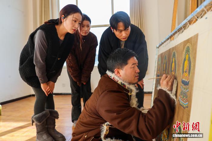 12月10日,青海省黄南藏族自治州同仁市胜境画院内,唐卡画师夏吾尖措(右一)为学生示范唐卡绘画技艺。热贡唐卡源于当地独特的文化生态,被誉为绘画艺术中一面独具韵味的旗帜。如今,许多画师通过系统授徒、开办传习工坊等方式,将调色、勾线、描金等核心技艺传授给年轻一代,让古老技艺得以传承和延续。中新社记者 薛蒂 摄