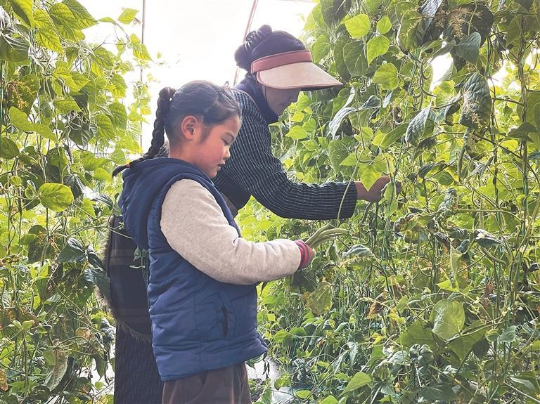 在班玛县蔬菜种植基地,工作人员带着孩子采摘新鲜蔬菜。祁万强 摄