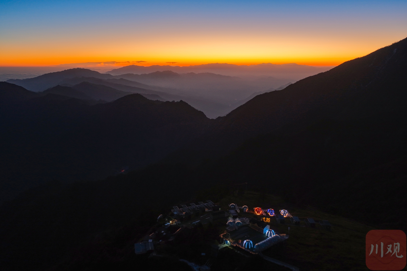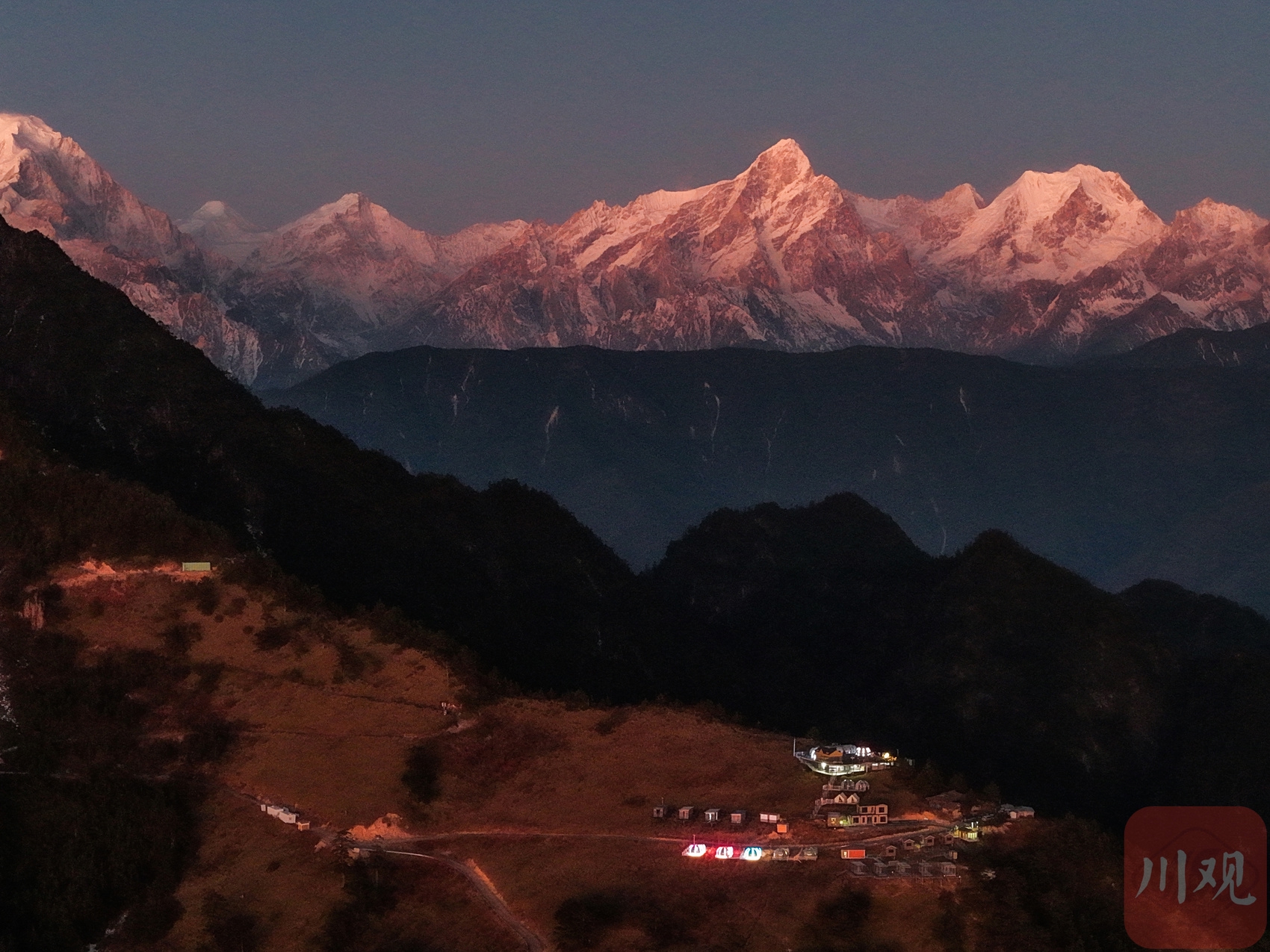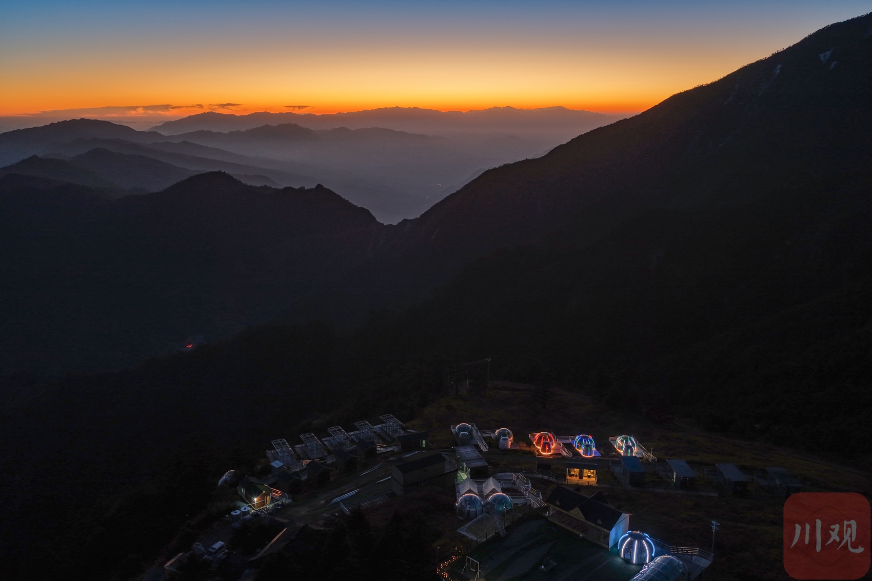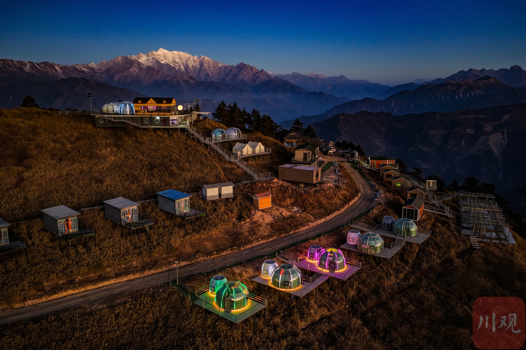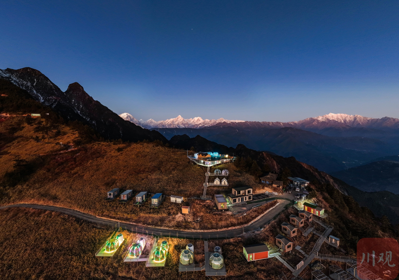 2025年12月18日清晨,四川省甘孜藏族自治州泸定县兴隆镇化林村海拔2080多米的星空房点亮山村。李向雨 摄