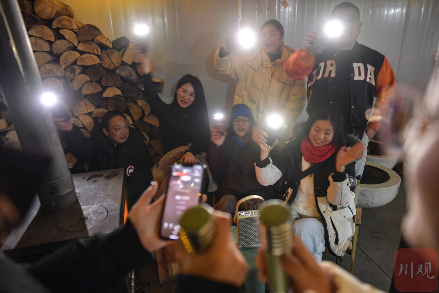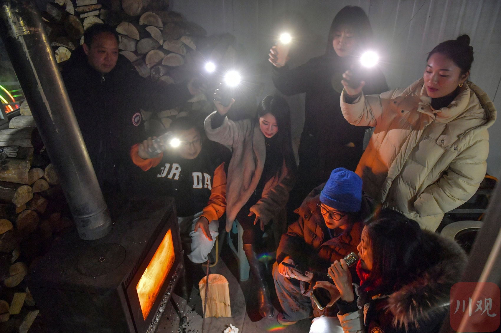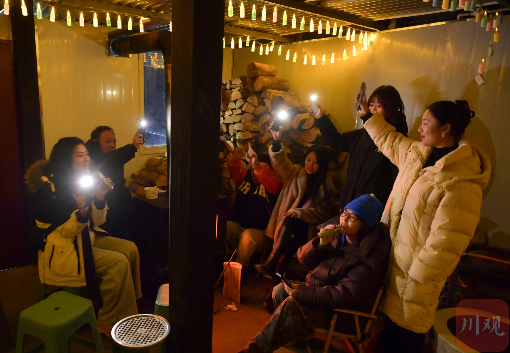 2025年12月17日晚,游客在四川省甘孜藏族自治州泸定县兴隆镇化林村海拔2080多米的星空房休闲娱乐。李向雨 摄