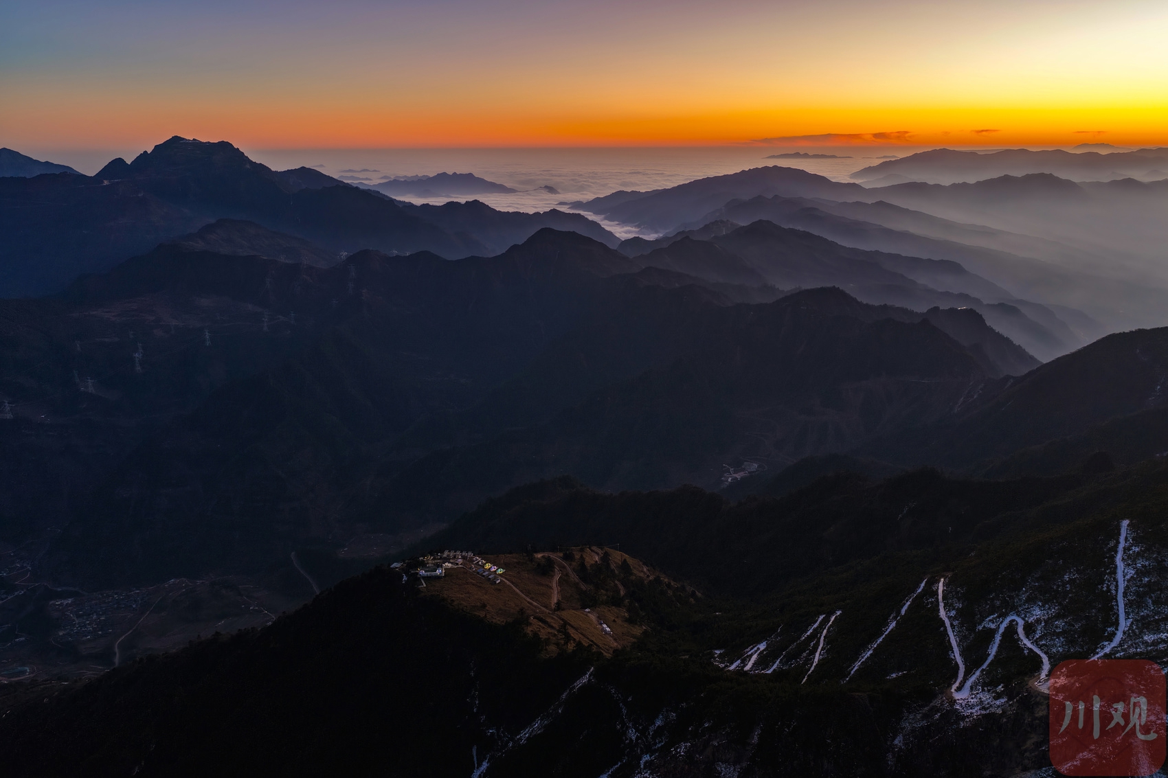 2025年12月18日清晨,游客在四川省甘孜藏族自治州泸定县兴隆镇化林村海拔2080多米的星空房附近拍摄日出。李向雨 摄
