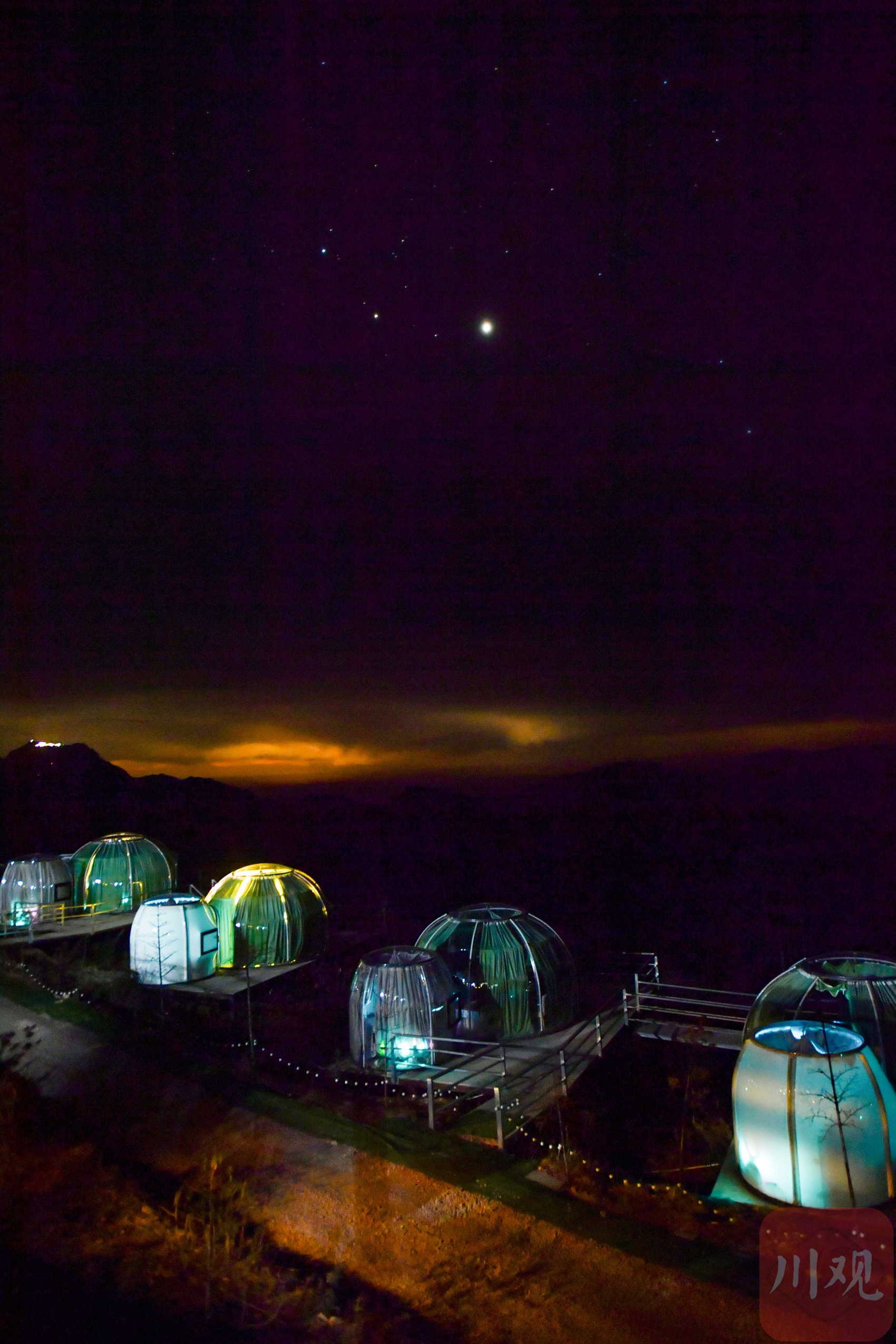 2025年12月18日清晨,四川省甘孜藏族自治州泸定县兴隆镇化林村海拔2080多米的星空房点亮夜空。李向雨 摄