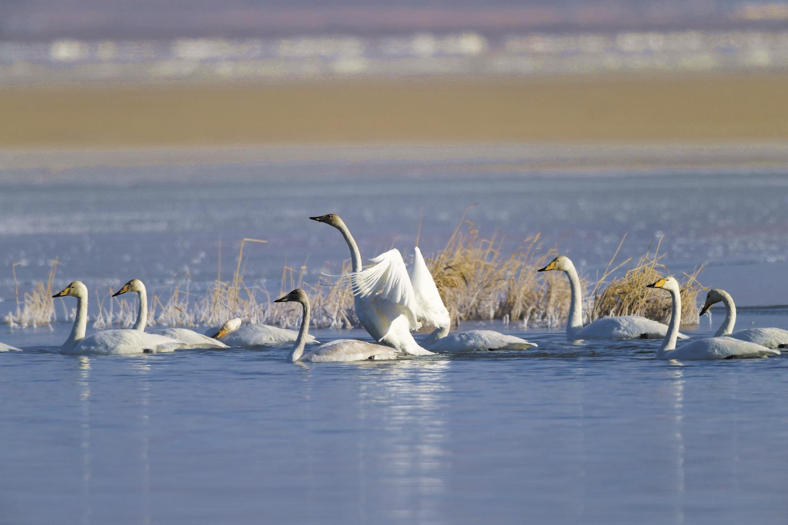都兰湖上展翅的大天鹅。