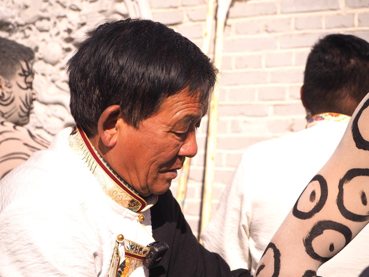 国家级非遗代表性传承人阿吾在给“於菟”仪式参与者绘制图腾。新华社记者 白玛央措 摄
