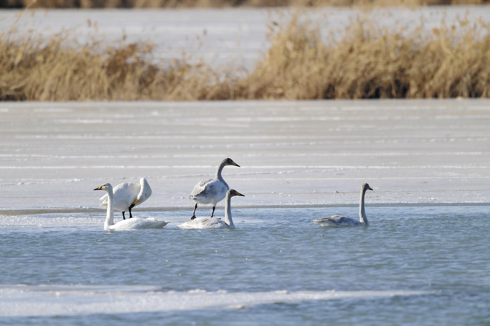 往前走了好一段路,终于看到一群大天鹅的身影。这几天跑监测点,几乎每个地方都能见到大天鹅,它们有的羽毛雪白,有的却是灰色的。向水鸟监测员询问才得知,灰色羽毛的是亚成体,等长到成年,羽毛就会慢慢变白,而且年龄越大,羽毛越白。这种情况不光大天鹅有,很多鸟都这样。我之前见过灰色的黑颈鹤,还纳闷怎么不是黑色的,原来那也是亚成体,涨知识了。