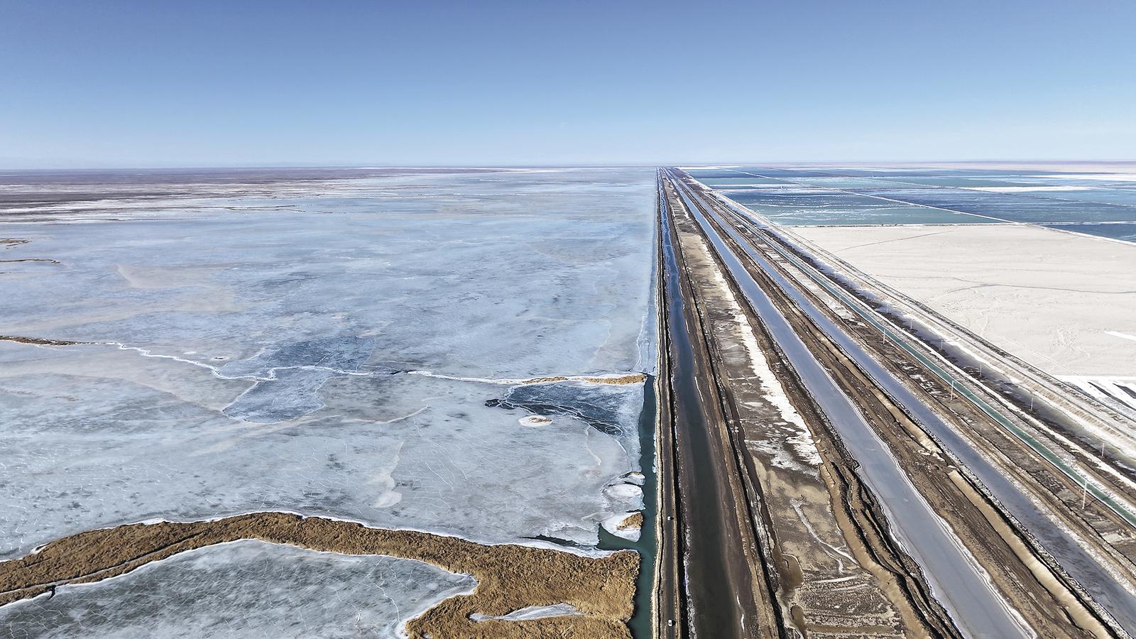 晨曦慢慢爬上察尔汗盐湖,晶莹的盐花反射着刺眼的光,车子开在万丈盐桥上,一侧是泛着浅绿色的咸水卤水,静静流淌;另一侧的淡水湿地早已结冰,边缘处还有河水在流淌,水里零星游着白骨顶、普通秋沙鸭等常见水鸟。