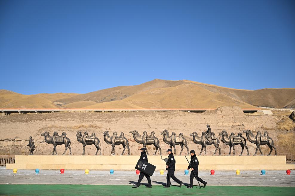1月9日,在青海省海北藏族自治州祁连县峨堡镇,峨堡派出所的民辅警在街道巡逻。新华社记者 张龙 摄