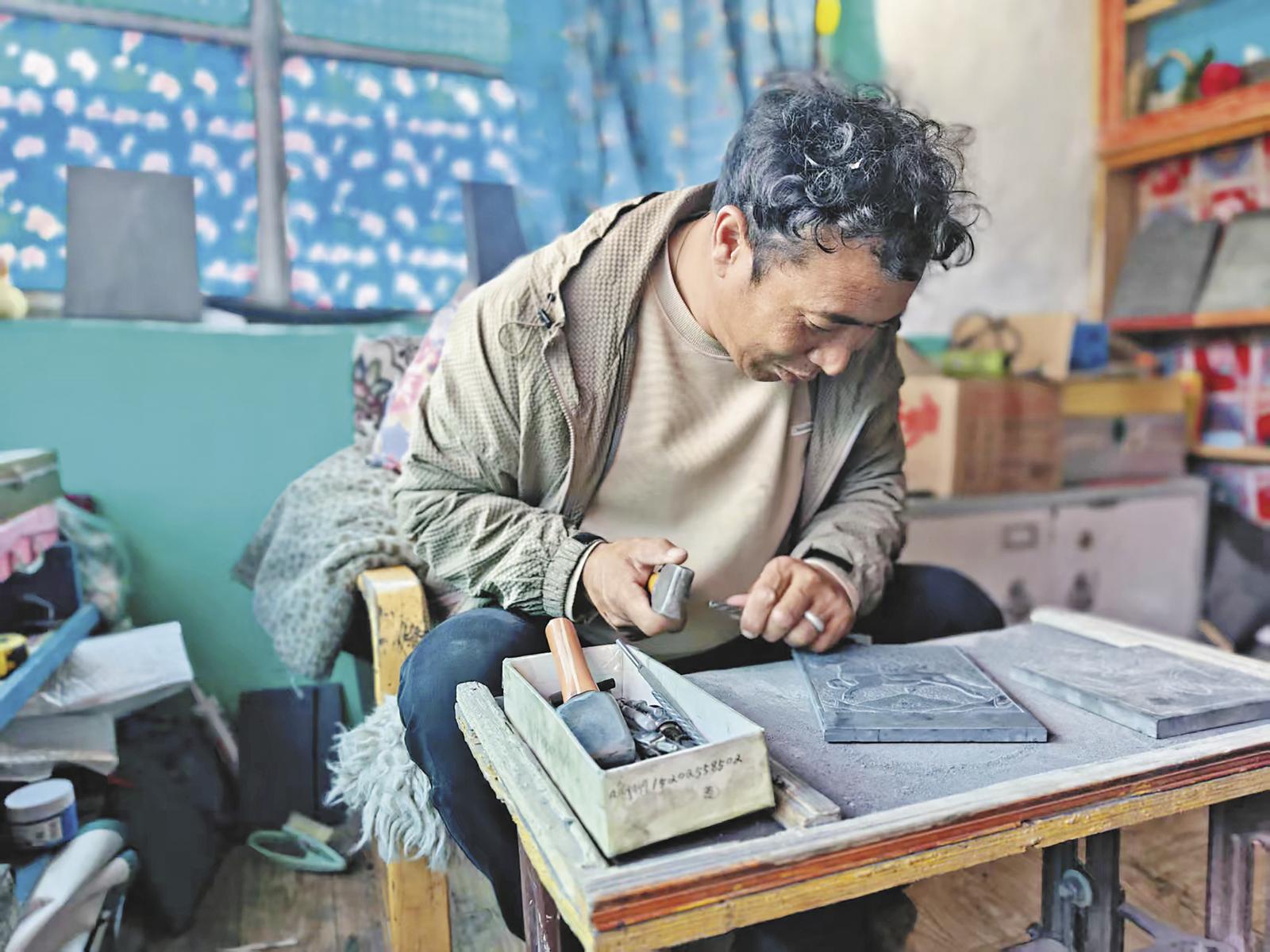 1月9日,当初升的阳光掠过青海省黄南藏族自治州泽库县和日镇和日村的屋檐,38岁的叶忠已收拾完院落,握起那把相伴二十多年的刻刀,青石板上,刻刀游走间,精美的图案渐渐浮现。