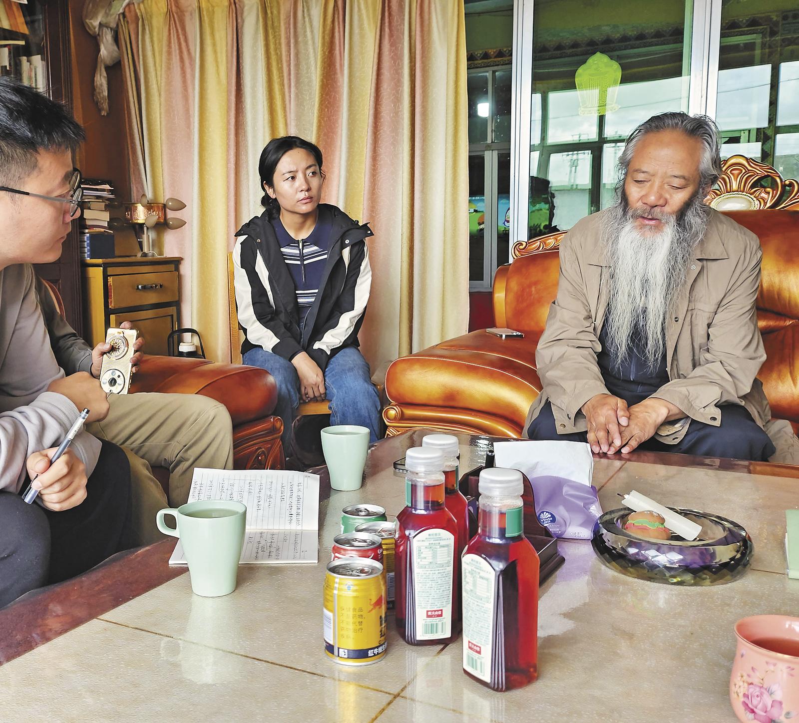 文才家住青海省玉树藏族自治州治多县文化馆附近,走进院子,阳光洒在修剪整齐的草坪上,中央那一顶帐篷格外醒目。“欢迎来我家做客,老师们请坐,我给你们倒茶。”文才热情地迎了上来。他用流利的普通话与我们交流,长长的白胡子和睿智的眼神,散发着文人气息。