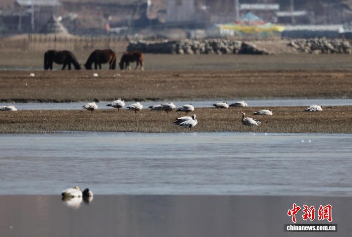 1月22日,在纳帕海越冬的鸟群与马匹、村庄构成和谐画卷。黄兴鸿 摄