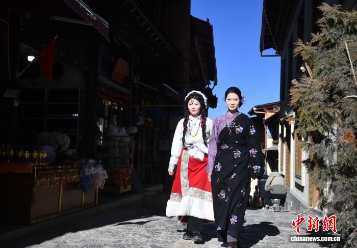 1月22日,两名游客身穿藏族服装游览独克宗古城。黄兴鸿 摄