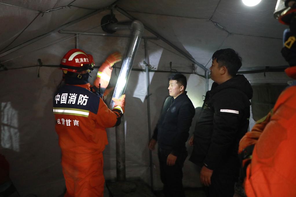 1月26日晚,在甘南州迭部县电尕镇哇曲村临时安置点,消防救援人员在应急帐篷内帮助群众安装煤炉烟筒。 新华社记者 张智敏 摄