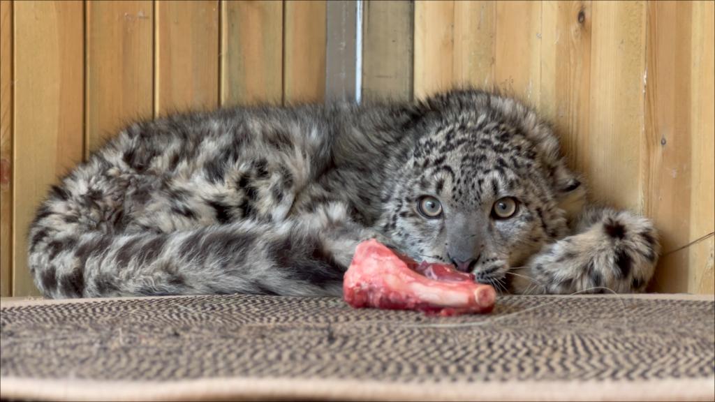 雪豹“凌小蛰”在身体逐步恢复健康后进食。