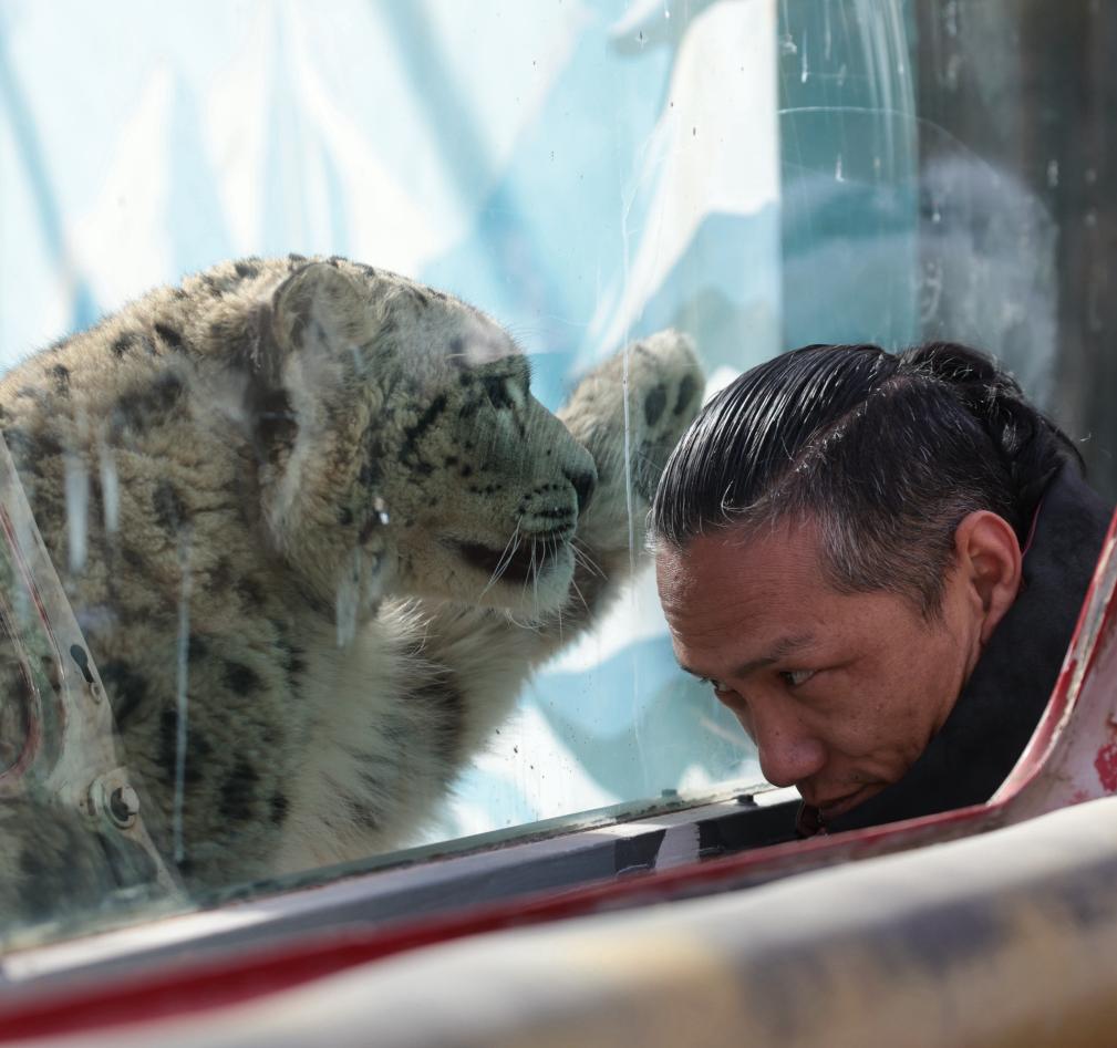 雪豹“凌小蛰”在雪豹馆和兽医赵海龙隔窗互动。