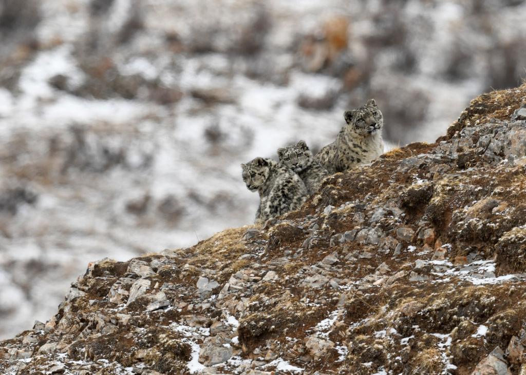 三只雪豹在三江源国家公园内栖息。