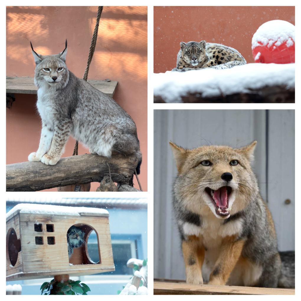 这是被网友戏称为动物园“F4”(猞猁、雪豹、兔狲、藏狐)照片。(拼版照片)