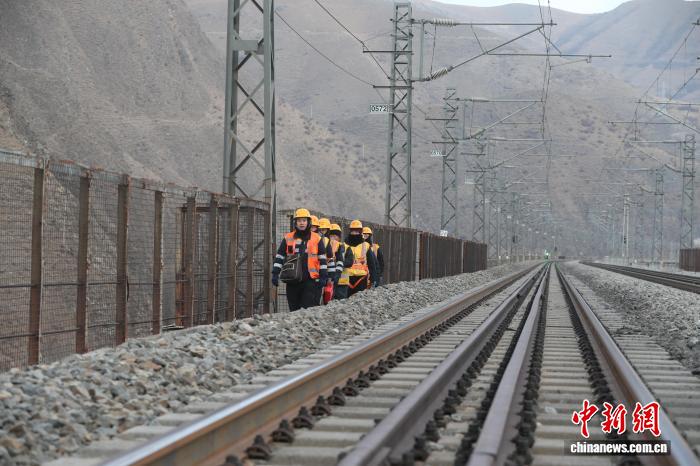 2月2日,在青海省西宁市湟源县新民村湟水河特大桥上,中国铁路青藏集团有限公司西宁工务段的桥隧工正巡检。中新社记者 张忠苹 摄