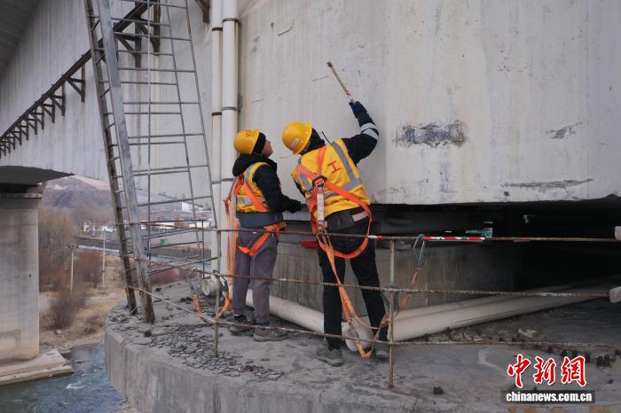 2月2日,在青海省西宁市湟源县新民村湟水河特大桥上,中国铁路青藏集团有限公司西宁工务段的桥隧工正检查桥墩安全。中新社记者 张忠苹 摄