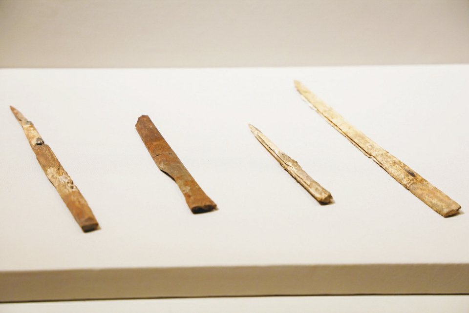 “我们可以看到展出的骨梗石刃刀,是由两种材质制作而成的。”现场,四川博物院讲解员赵国美向记者介绍,孔龙村先民们在制作这一器物时,先将骨头人工打磨出一个凹槽,再将磨制好的石片嵌在凹槽中,变成了组合器。“骨头的韧性很强,不易断,石头又很锋利,两者的结合规避了单一工具的缺陷,体现了孔龙村先民们的智慧。”