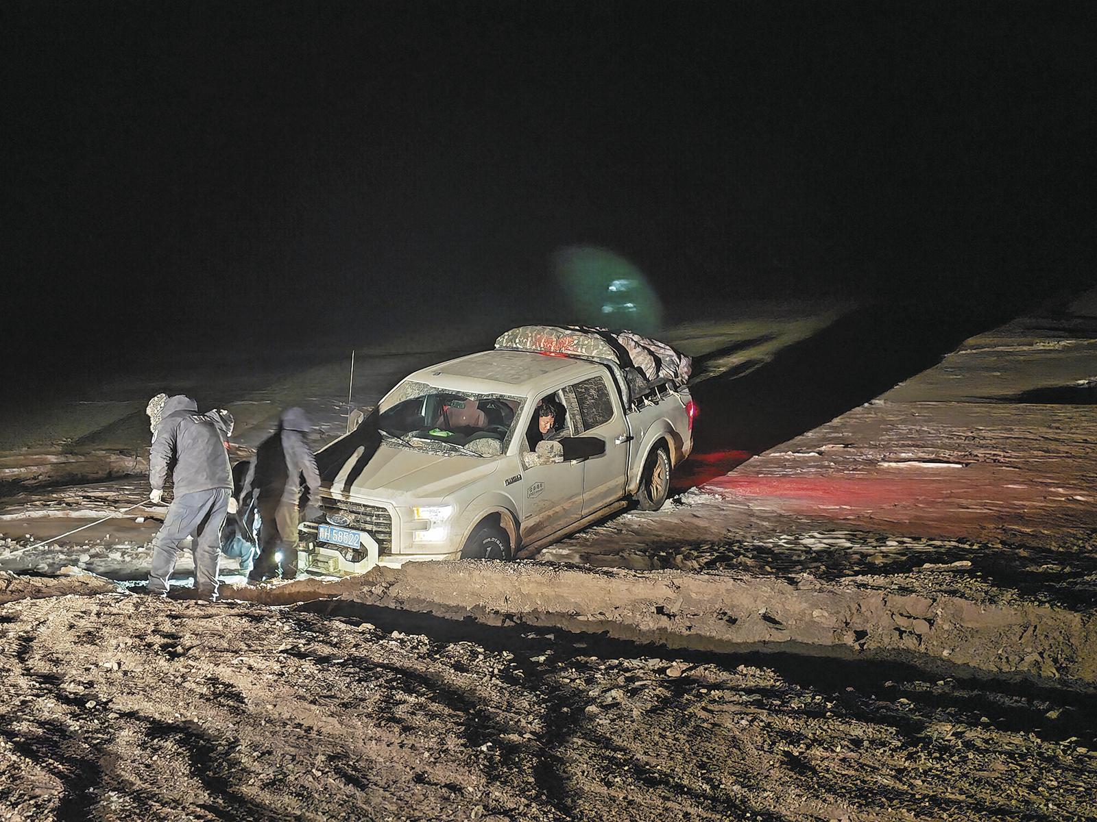 “此行主要为打击N35非法穿越,我们沿着非法穿越者常走的路线,路上也遇到了很多困难。”随队记者口述,为了尽早赶到库南保护站,8日20时一行人从太阳湖出发,车辆却不断陷入冰河,还遭遇了爆胎。9日早晨6时,大家才在车里休息了两个小时,之后接着赶路。在断断续续的信号中,随队记者陆续发回现场照片和视频。