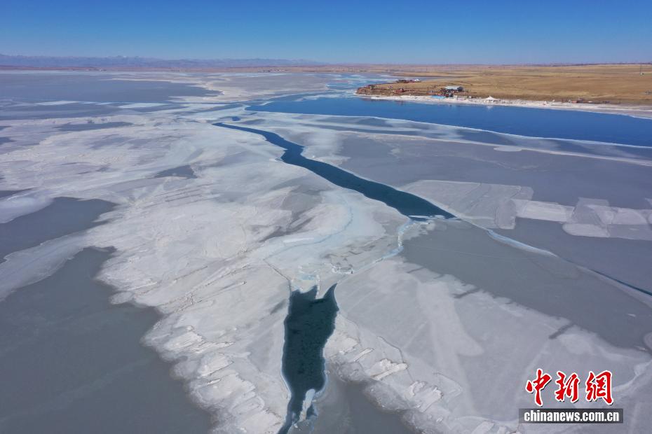2月13日,青海省海北藏族自治州刚察县圣泉湾景区,中国最大的内陆咸水湖青海湖已进入封冻期。昔日碧波荡漾的湖面被厚冰覆盖,冰裂纹理如大地墨痕,与远处高山相映成画,尽显高原冬日的静谧。(无人机照片)中新社记者 张忠苹 摄