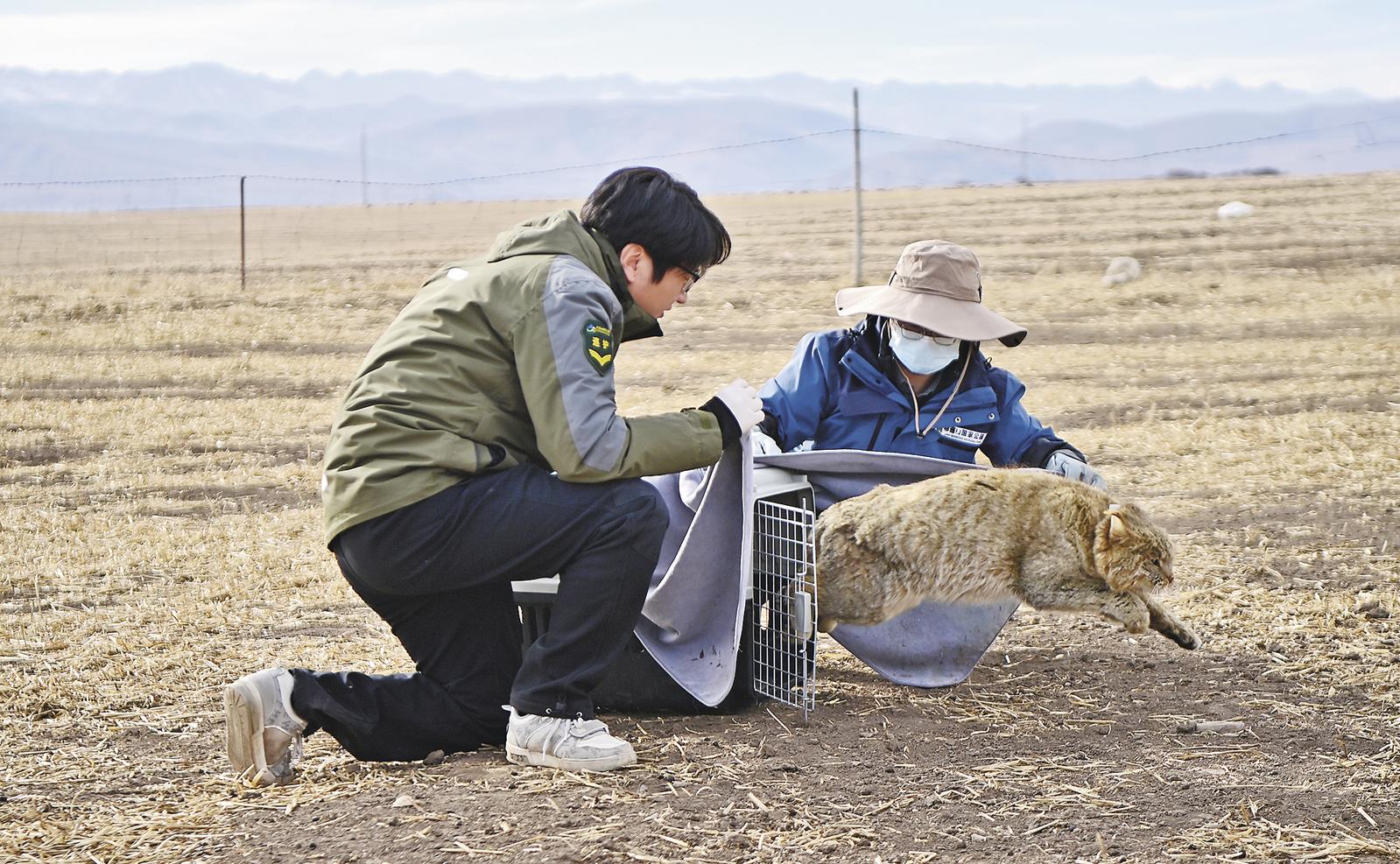 2月11日,祁连山国家公园野生动物救护繁育站在海北藏族自治州门源回族自治县老虎沟成功放归一只成年雄性荒漠猫。