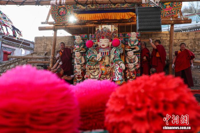 3月3日,青海省西宁市湟中区塔尔寺僧人将上花院的酥油花主尊——文殊菩萨固定在花架上。马铭言 摄