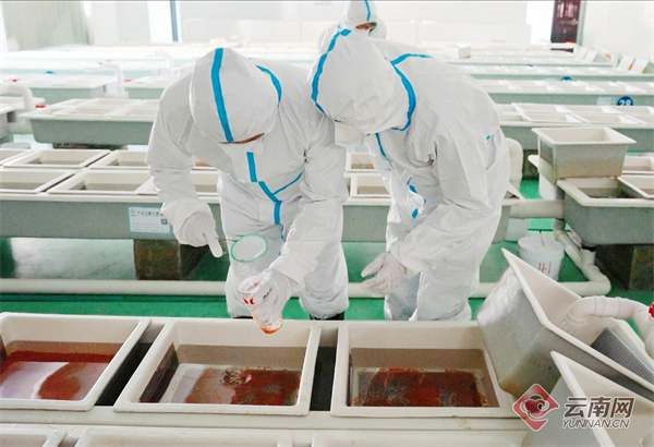 海关关员在迪庆州进境水生动物指定隔离检疫场对进口虹鳟鱼卵开展现场抽样